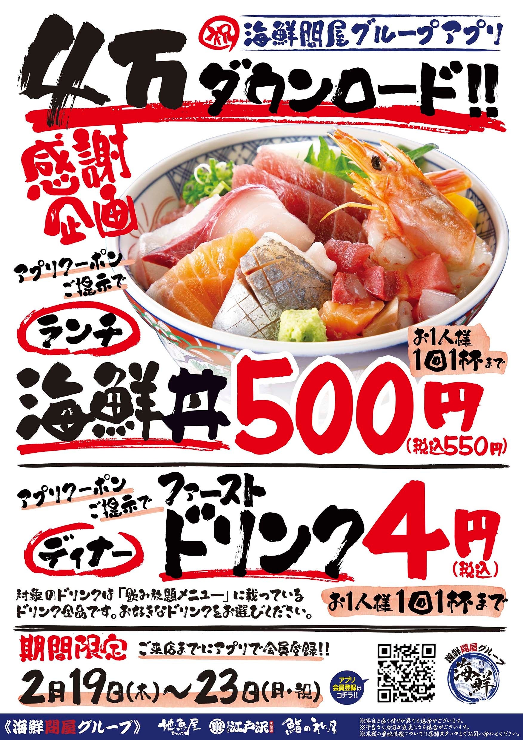 【地魚屋】アプリ4万ダウンロード記念!ランチとディナーで感謝イベントを開催いたします