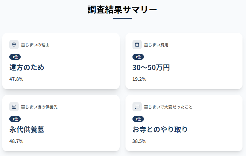 墓じまい後(または予定)の供養先は「永代供養墓」48.7%が最多でした。サービス側は、後継者がいない場合でも供養が続く仕組みへの需要が高まる可能性があるとしており、費用感や手続き・寺院対応の情報整備が今後の焦点になりそうです。