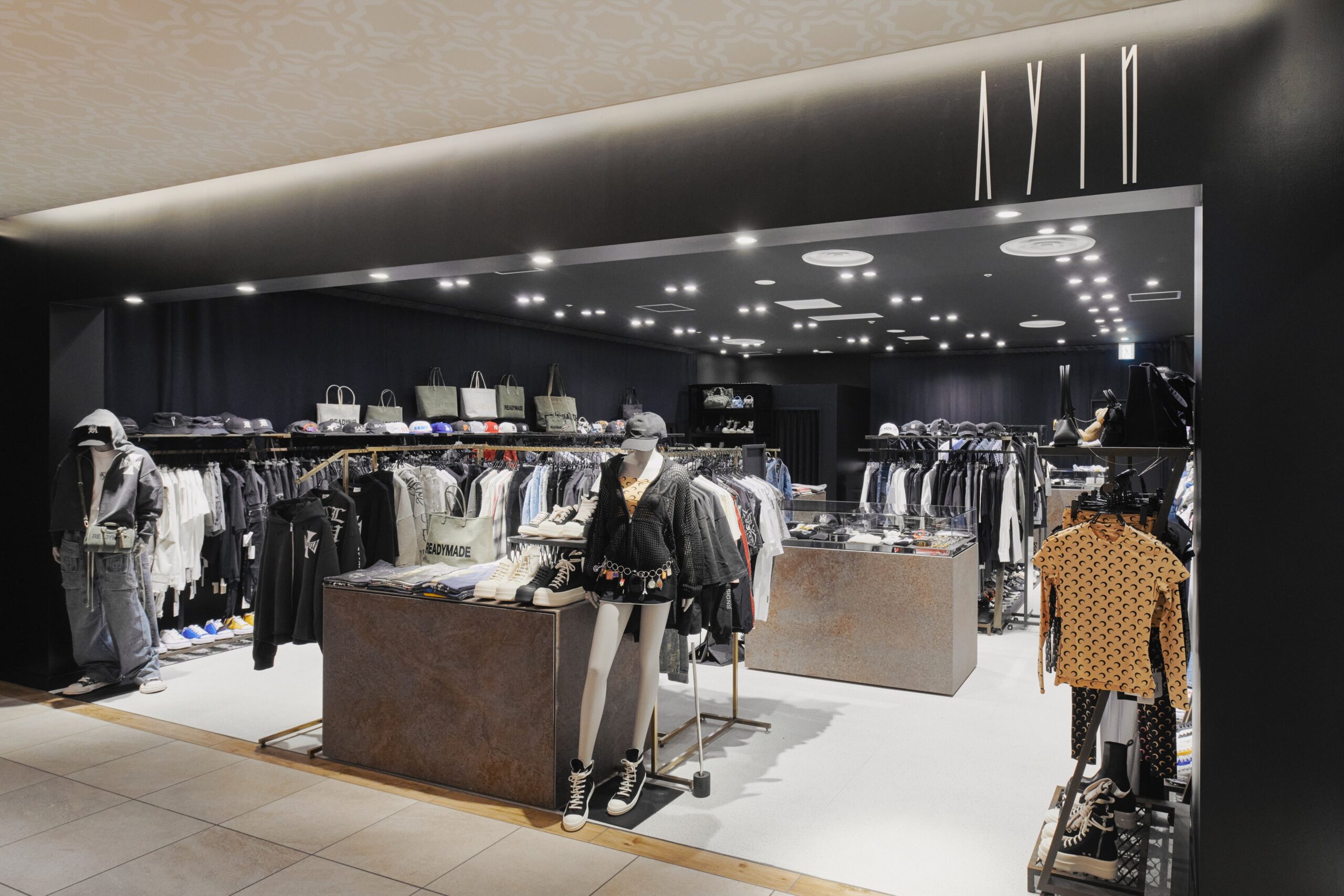 企画したのは大阪府のAYURAで、AYINは海外インポートが90%以上、取扱いは100ブランド超としています。会場では壁面・天井を黒で統一した売り場を設け、Rick Owensのシャツアウター(税込416,900円)やDRKSHDWのカーゴパンツ(税込178,200円)、MARINE SERREのカットソー(税込66,000円)なども展開します。