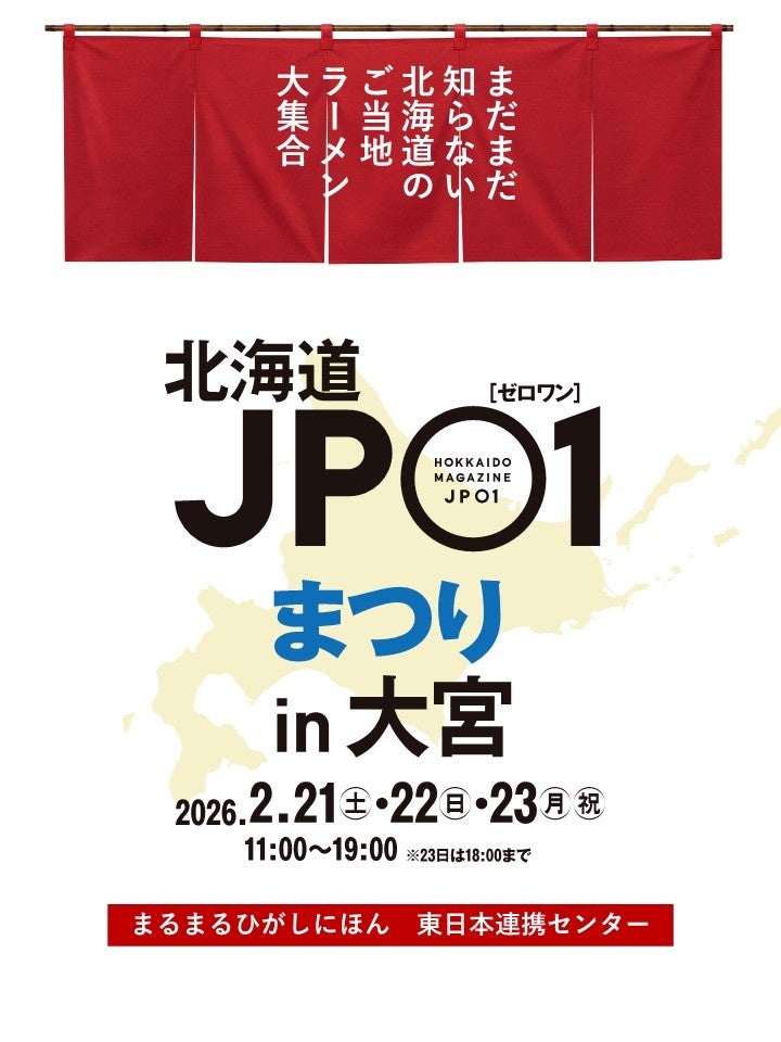 さいたま市は2月21日から23日まで、東日本連携センター「まるまるひがしにほん」(さいたま市大宮区大門町1-6-1)で「JP01まつり in 大宮~ご当地ラーメンが大集合~」を開きます。時間は11時から19時で、最終日の23日は18時に閉館します。