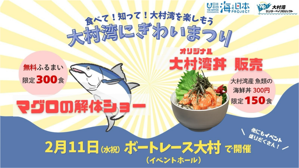 一般社団法人大村湾ワンダーベイは、2026年2月11日(水祝)10時~17時に「大村湾にぎわいまつり」をボートレース大村のイベントホール(長崎県大村市)で開きます。入場は無料で、限定300食のまぐろ無料ふるまいなどを実施します。