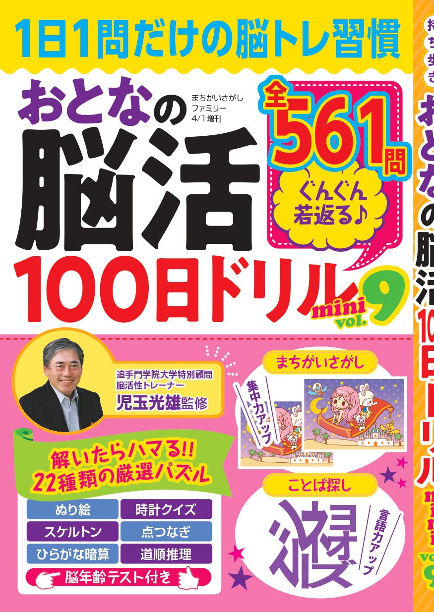 監修は追手門学院大学スポーツ研究センター特別顧問で、右脳活性プログラムのトレーナーでもある児玉光雄氏です。まちがいさがし、漢字、時計クイズ、点つなぎなど複数ジャンルを組み合わせ、毎日解く「出力作業」を習慣化することで、認知機能の維持・活性化や脳の廃用性萎縮の予防につなげる狙いです。