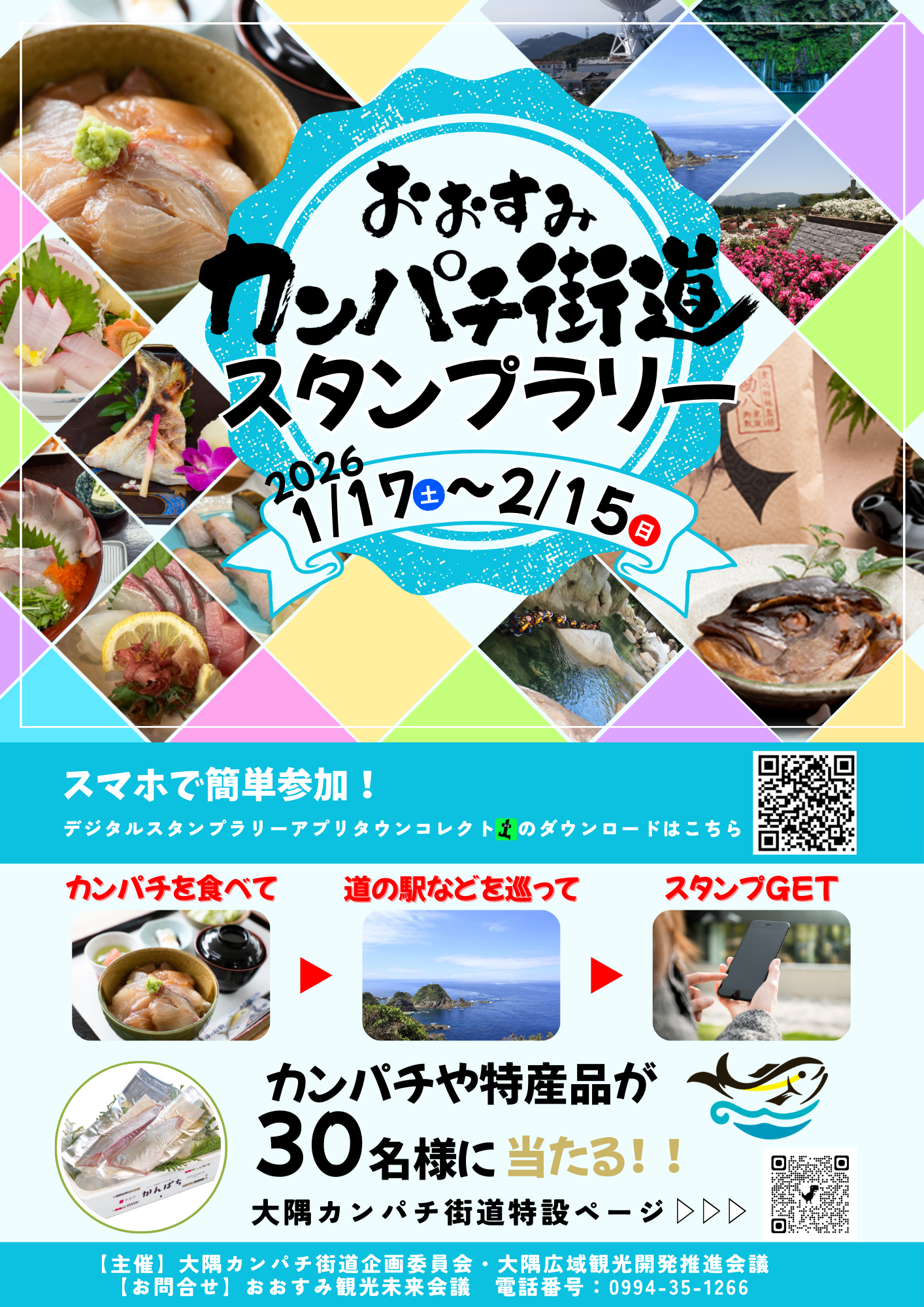 鹿児島県大隅半島で、カンパチをテーマに周遊する「大隅カンパチ街道スタンプラリー」が2026年1月17日(土)~2月15日(日)に実施されます。飲食店、テイクアウト店、道の駅、観光スポットなど対象地点でQRコードを読み取り、デジタルスタンプ(ポイント)を集める仕組みで、抽選で合計約30名にブランドカンパチの刺身(冷凍配送)やビンタ煮、大隅特産品などが当たります。応募はスタンプ2個・4個・6個の規定数で各枠に申し込みでき、応募時には飲食店スポットでのポイント獲得が必須です。飲食店のスタンプ獲得数が多いほど当選率が上がる方式も取り入れ、食体験を伴う回遊を促します。大隅半島はカンパチ養殖日本一とされ、黒潮の影響を受ける海域や水深200メートル超の錦江湾などの環境が高品質な生産を支えてきました。地域には「かのやカンパチ」「海の桜勘(垂水かんぱち)」「ねじめ黄金カンパチ」「辺塚だいだいカンパチ」などのブランドもあり、キャンペーンを通じて消費拡大と観光需要の底上げが進むかが焦点です。