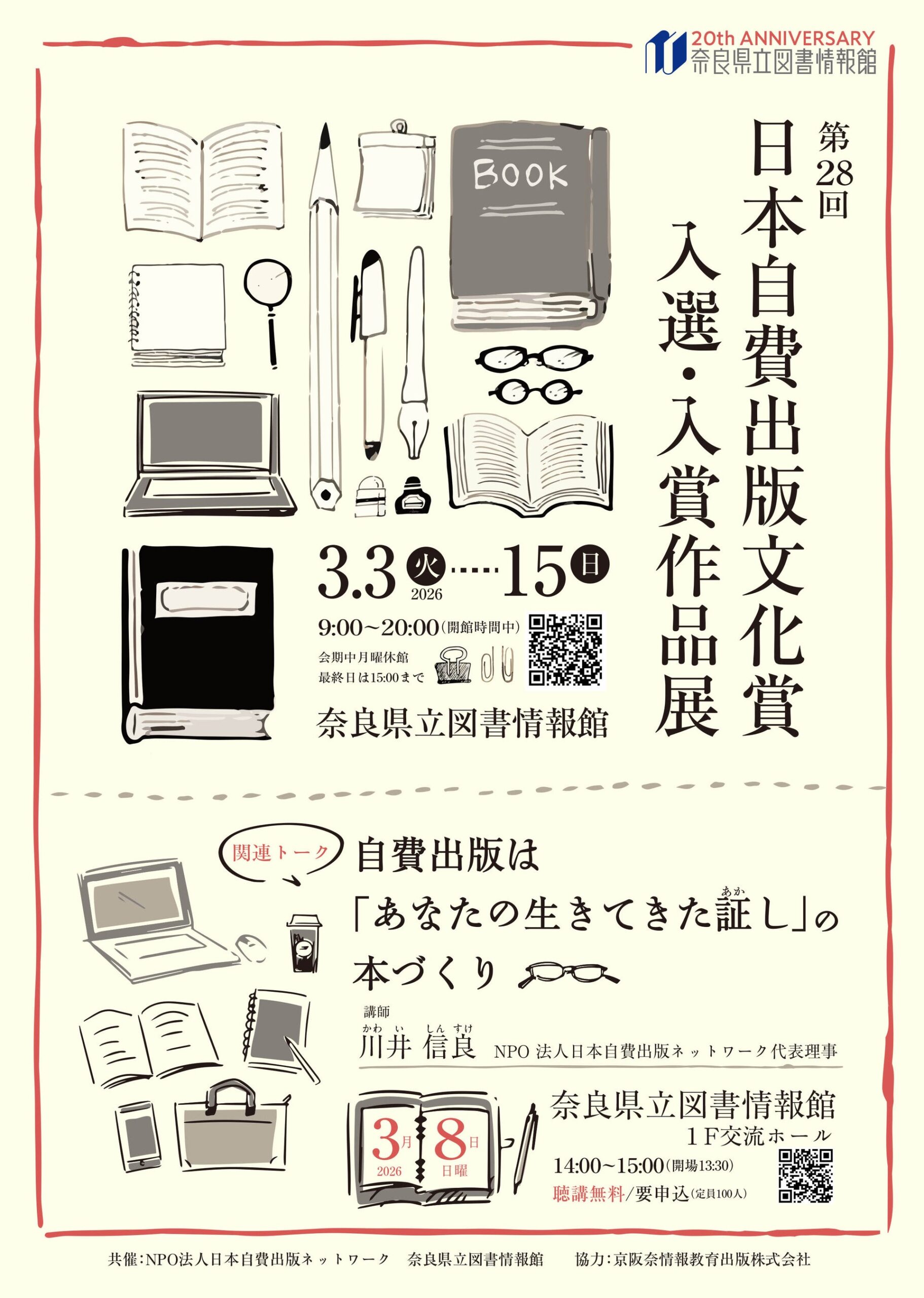 第28回日本自費出版文化賞 入選・入賞作品展(2026年3月3日(火)~15日(日))詳細URL:https://www.library.pref.nara.jp/gallery/4778