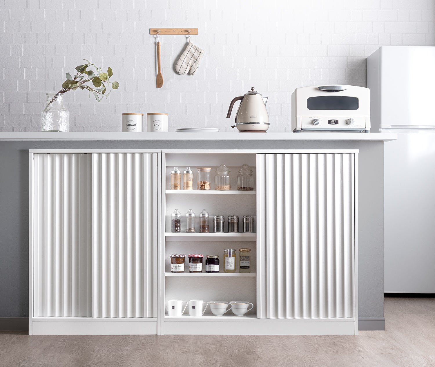 ダイニング周りは小物が散らかりやすい一方、一般的な収納家具は奥行が深く通路動線を妨げやすいことがあります。SNSで「見せる収納」が広がる中、常時の整頓や埃対策が必要という声もあり、扉付きで生活感を隠せる収納需要が背景にあります。