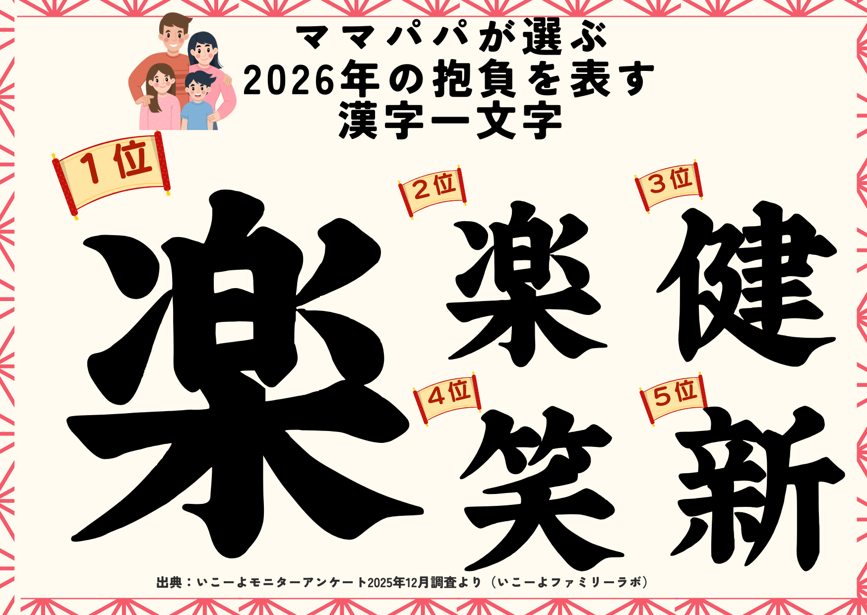 子育て情報サイト「いこーよ」を運営するアクトインディ(東京都品川区)の「いこーよファミリーラボ」は、子育て世帯935人に「2026年の抱負を漢字1文字で表す」調査を行い、最多は「楽」でした。回答には「毎日を楽しく」と「家事・育児・仕事を少しでも楽に」の両方の意味が重なりました。調査は全国の「いこーよ」会員を対象に、2025年12月にインターネットで実施しています。上位には「健」「幸」「笑」も入り、家族の健康や日常の充実を重視する傾向が見えます。「楽」を選んだ背景として、育休明けの仕事復帰やワンオペ育児、小1の壁(小学校入学で預け先や生活リズムが変わり負担が増えること)を見据え、「無理を減らしたい」という声があるとしています。今後、子育て支援や家事負担を軽くするサービスへの需要が、生活者の実感に沿う形でさらに強まる可能性があります。