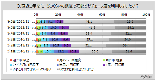 マイボイスコムの調査で、直近1年間に宅配ピザチェーン店を利用した人は約25%だった。利用者のうちインターネットで注文した人は約85%で、ネット注文理由は「割引サービス、クーポンなどがある」が49.6%と最多となった。調査は2025年11月1~7日、11,285人が回答した。利用チェーンは「ドミノ・ピザ」58.0%、「ピザハット」32.6%、「ピザーラ」28.1%。利用場面は「家族といるとき」47.9%、「ピザが食べたくなった」43.2%が上位だった。重視点は「味が好み」59.5%、「価格」46.2%で、過去調査比では「ネットやアプリで注文できる」が増え、「手元にチラシがある」は減る傾向という。今後は割引やポイントなどネット誘導施策の比重が一段と高まる可能性がある。