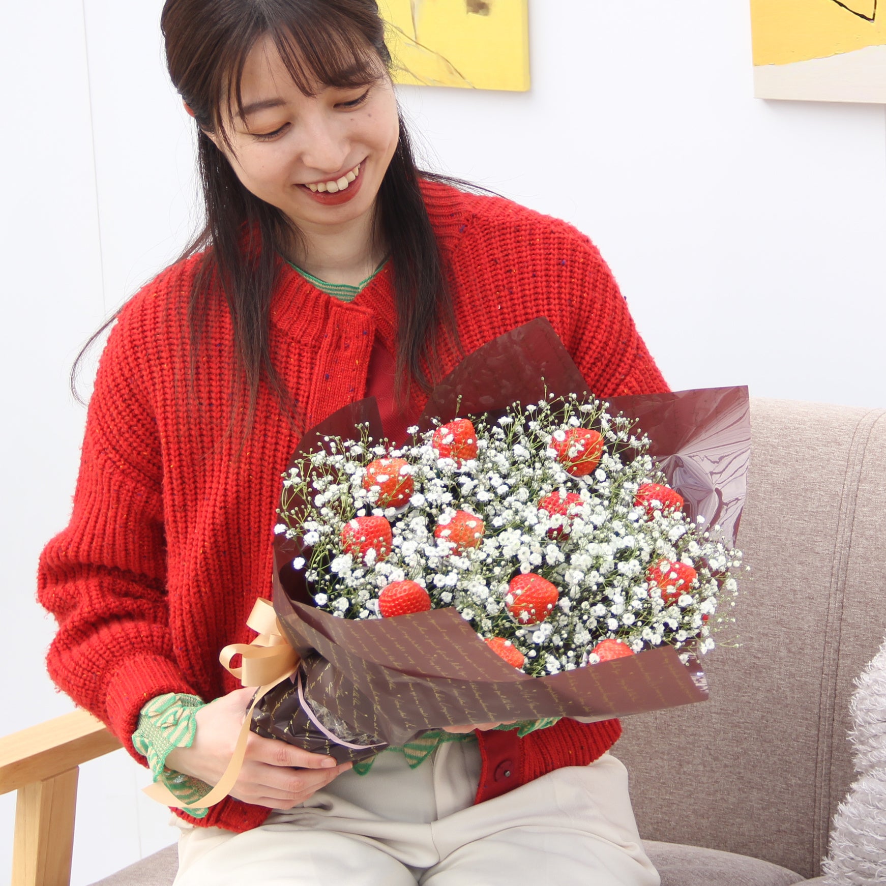 同商品は、食べられる完熟いちごを花束のように束ね、かすみ草と組み合わせた点が特徴です。宅配での崩れにくさと見た目の可愛さ、味わいを両立するため、2〜3年かけて試行錯誤を重ね、いちごと花を固定する独自構造を採用しています。この構造は実用新案登録済みです。