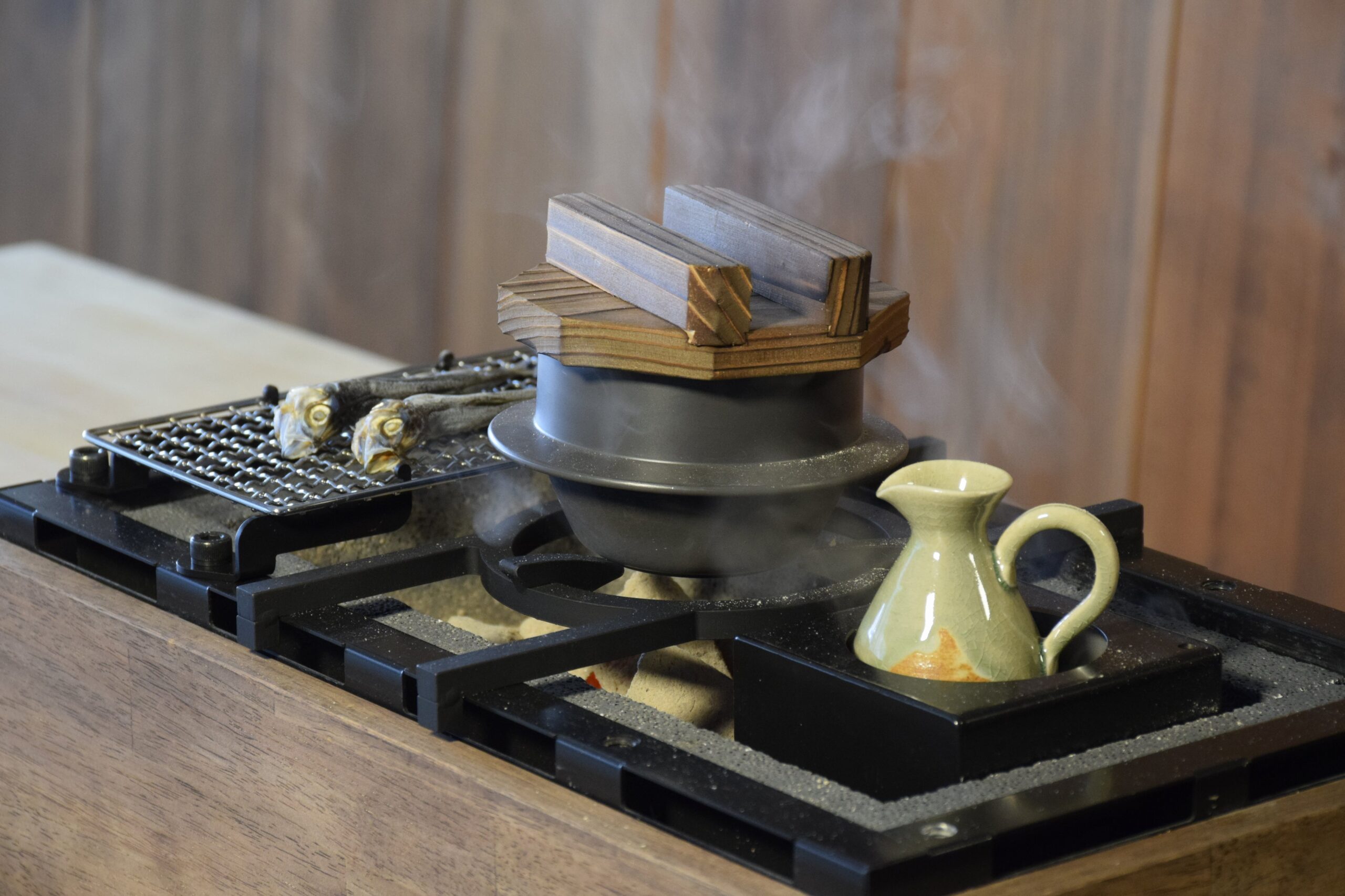 同社は、日本の炭火文化(七輪・囲炉裏・火鉢)を家庭でも楽しめる形で提案する狙いです。割烹七輪/2848では「炭火湯沸かし」や専用五徳をオプションで追加し、炭火調理だけでなく湯沸かし用途も想定しています。