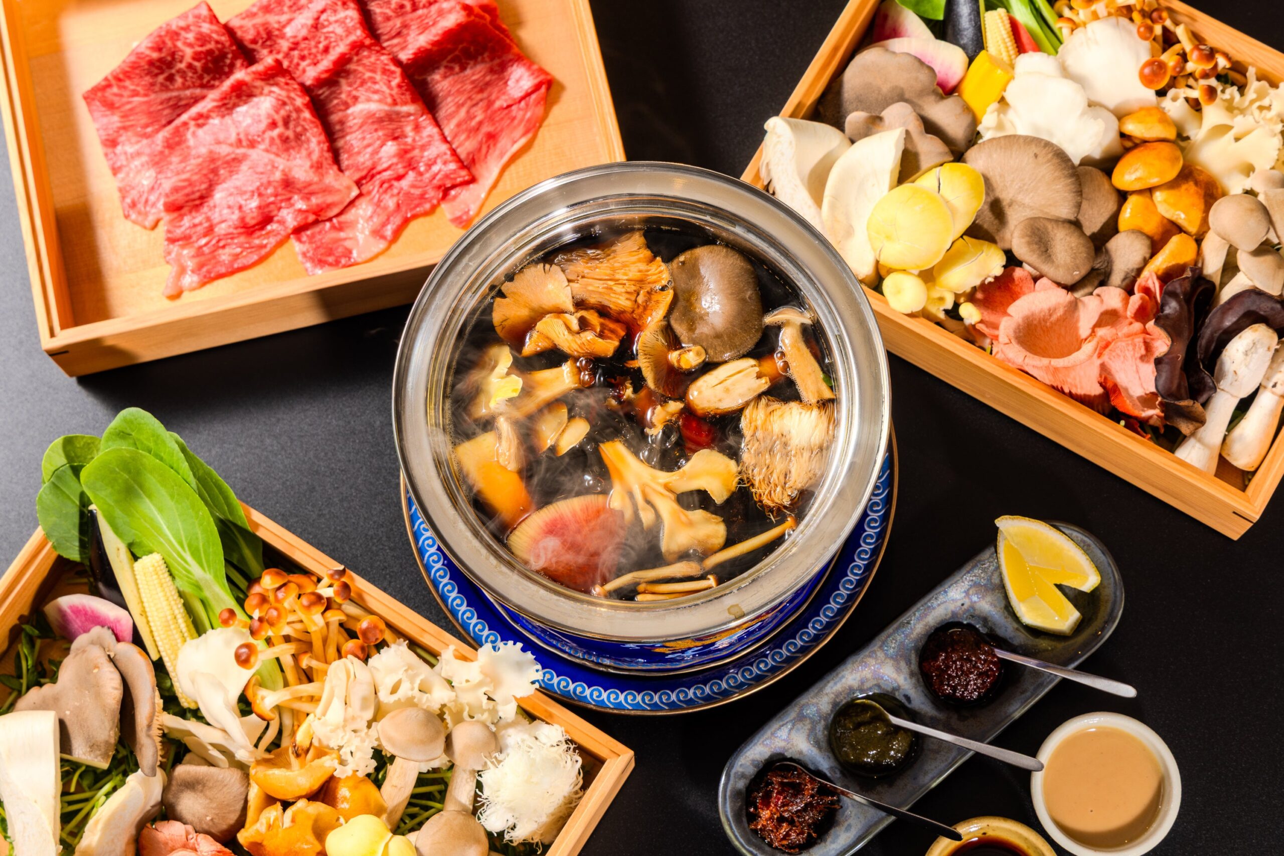 同店はアラカルトを設けず、鍋コース3種のみを提供します。価格は「喜楽」5,500円(税込)、「舞楽」8,800円(税込)、「雅楽」11,000円(税込)で、天然きのこや野菜を軸に、海鮮(ホタテ・海老団子)や鶏肉、石垣島きたうち牧場プレミアムビーフ、アグー豚などを組み合わせます。
