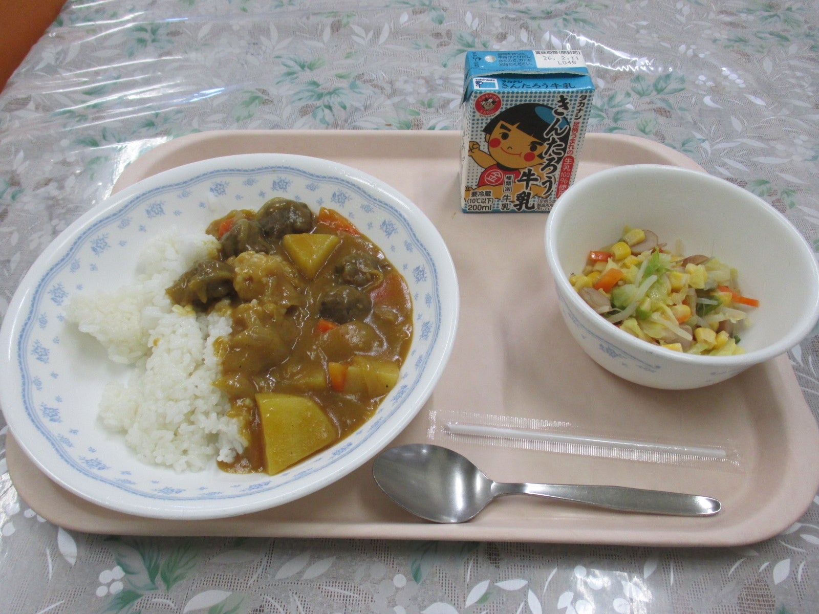 提供メニュー: 牛乳、ジビエカレーライス(カレーの具材として鹿肉団子を使用)、野菜ソテー