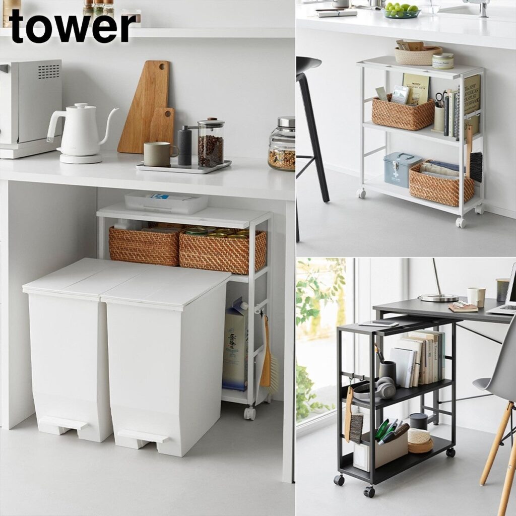 新商品のうち「ゴミ箱裏スリムワゴン タワー」は、ゴミ箱の背面など狭い場所に置いて収納を増やす設計で、中段棚板の高さは3段階で調節できます。「くず入れ付き折りたためる携帯ティッシュケース タワー」は、裏面にくず入れ用ポケットを備え、スナップボタン付きストラップで持ち運びを想定しています。