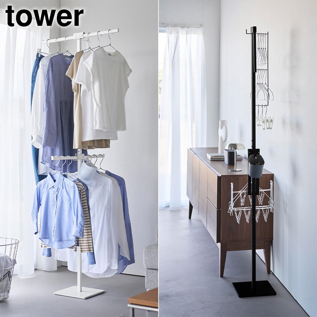 折り畳み室内物干しは、上段と下段のハンガーバーを互い違いに配置し、洗濯物同士の干渉を抑えて掛けやすくした設計です。支柱には小物ケースなどを引っ掛けられるようにし、洗濯周りの小物もまとめて整理できるようにしています。
