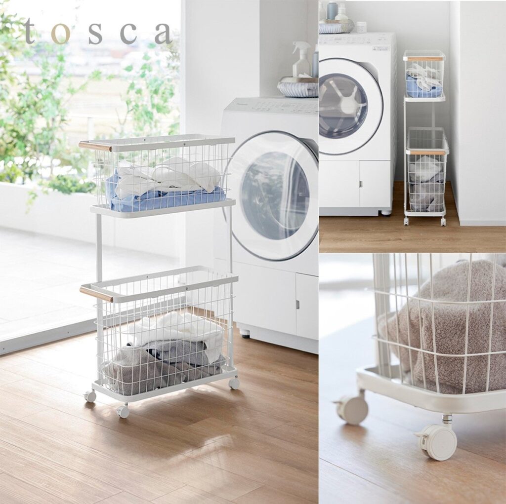 ランドリーワゴン+バスケット「トスカ スリム」は、M・Lサイズのバスケット対応で洗濯機横などの隙間に収まる細身設計。キャスター付きで移動しやすく、支柱2本のオープン構造により上下段のバスケットを縦横どちら向きでも出し入れできます。天然木ハンドルは持ち運びと収納の双方に配慮した可動式です。