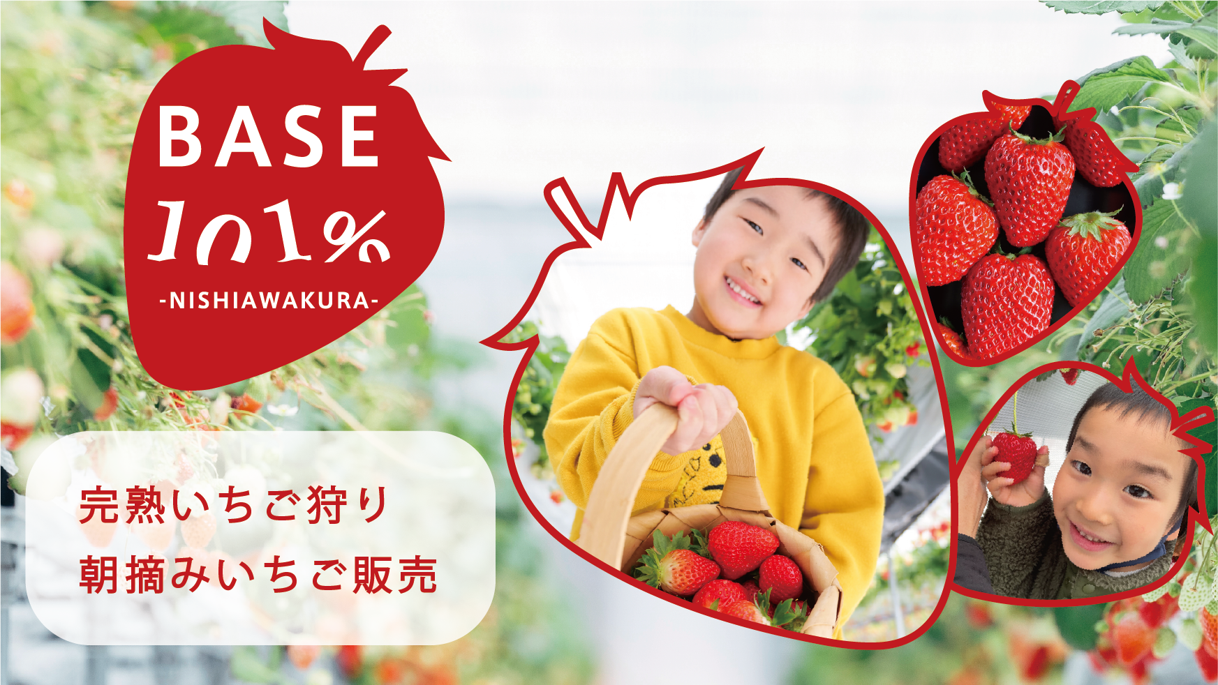 会場は英田郡西粟倉村長尾461-1。営業時間は10:00〜15:40(最終受付15:00)、毎週火曜定休、駐車場は無料で60台です。提供品種は紅ほっぺ、かおり野、よつぼし、ほしうらら、スターナイトの中から最大5種類で、育成状況により変動します。隣接のカフェ・レストラン「BASE101%」では完熟いちごの店頭販売や、いちごスイーツも提供します。