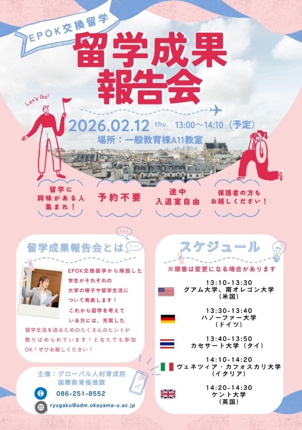 岡山大学(岡山市北区)は2026年2月12日13:00~14:30、短期留学プログラムEPOK(Exchange Program Okayama)から帰国した学生による「2026年2月留学成果報告会」を、津島キャンパス(東)の一般教育棟A11教室で開きます。参加対象は海外留学に関心のある人で、どなたでも参加できます。