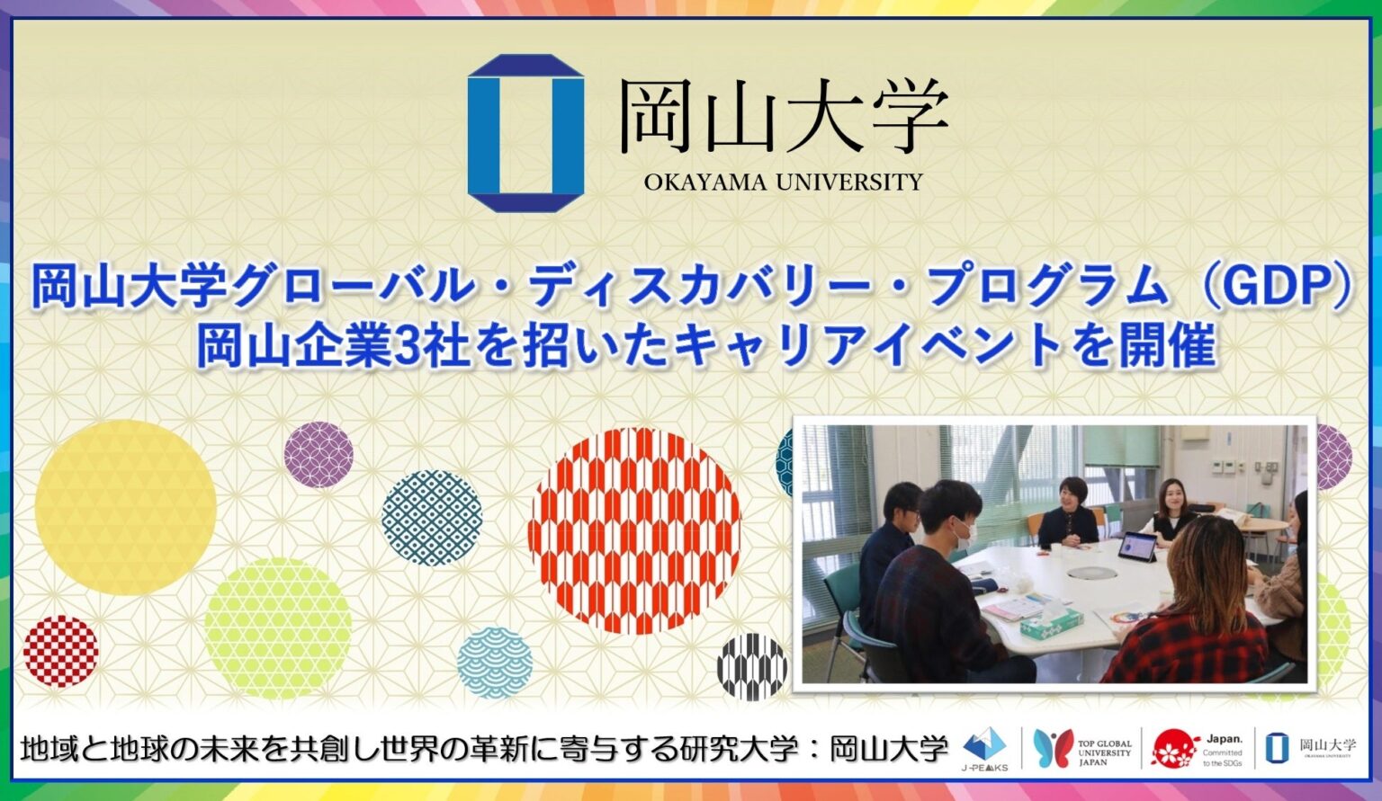岡山大学(岡山市北区)は2025年11月8日、グローバル・ディスカバリー・プログラム(GDP)の授業の一環として、岡山県内企業3社を招いたキャリアイベントを実施しました。学生約15人が参加し、企業担当者や教職員を含め会場には20人以上が集まりました。イベントでは各社が会社概要や事業内容を説明した後、担当者と学生がグループに分かれて交流しました。学生は、一般消費者向けではなく企業間取引を担うBtoB(企業向け取引)企業の仕事内容や業界の特徴を直接聞き、疑問点をその場で質問して理解を深めたといいます。大学側は、将来の進路や働き方を考える機会になったとしています。取り組みの内容は、2025年12月2日に同大が公開しました。今後は、参加企業やテーマの拡充などを通じ、学生のキャリア形成支援の継続が焦点になりそうです。