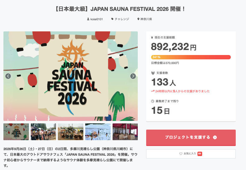 日本最大級のアウトドアサウナフェス「JAPAN SAUNA FESTIVAL 2026」が、CAMPFIREでクラウドファンディングを開始し、公開初日に目標金額37万円を達成しました。初日時点の支援総額は89万円超、達成率は249%超、支援者は133名です。
