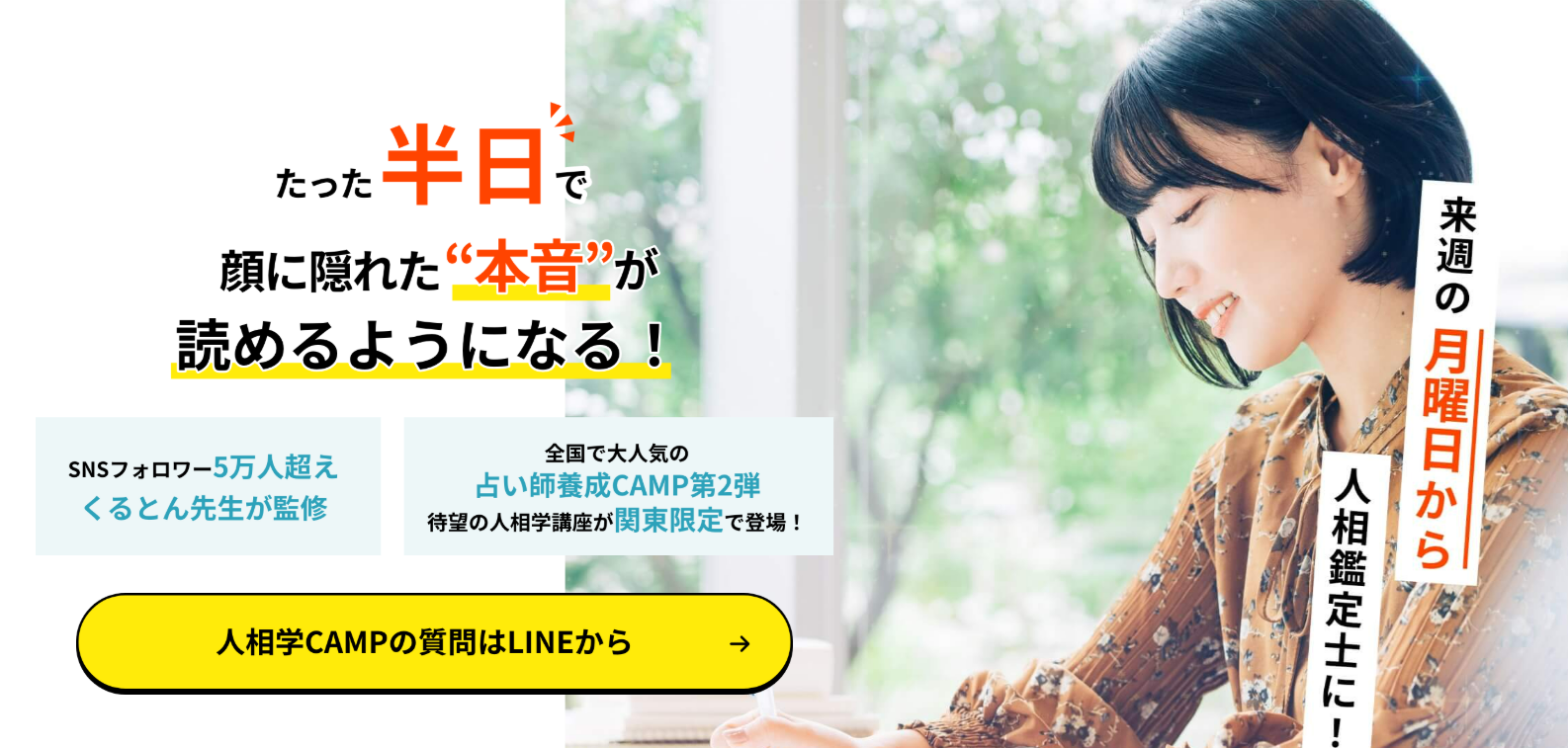 株式会社レイジーデイ(埼玉県川越市)は2月4日、対面で学ぶ人相学講座「人相学CAMP」を始めました。難しい専門用語を避け、半日で人相鑑定の基礎が身につくとしています。監修は川越の占い師くるとん先生で、SNS総フォロワー数は6万人です。
