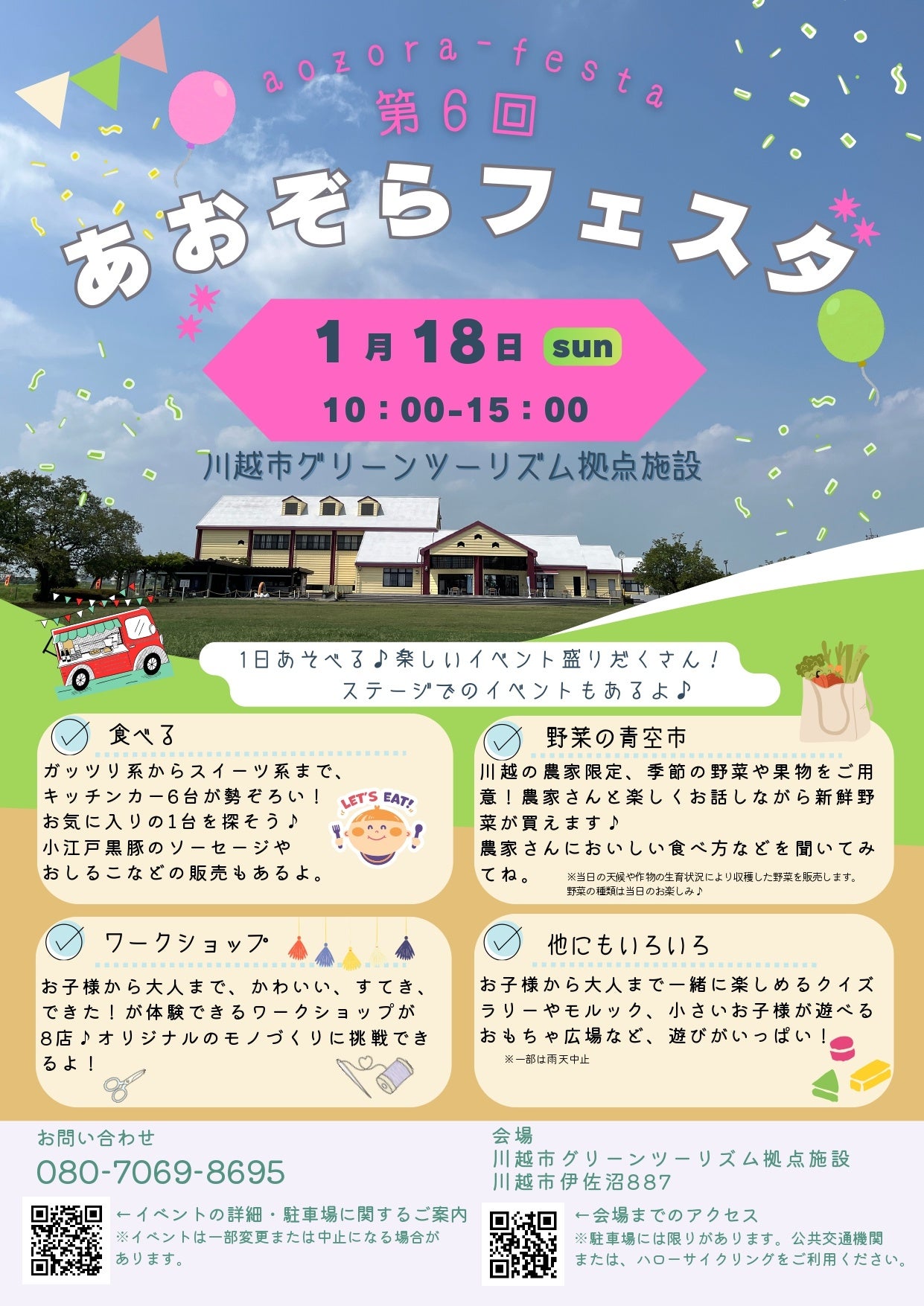 川越市のグリーンツーリズム拠点施設(川越市伊佐沼)で1月18日10時から、冬の屋外イベント「第6回 あおぞらフェスタ」が開かれます。入場は無料で、会場ではキッチンカー出店や川越産野菜の青空市などを実施します。青空市は農家と会話しながら購入できるのが特徴です。体験企画としてオリジナル作品づくりのワークショップ、親子で楽しめるモルック、小さな子ども向けのおもちゃ広場も用意します。当日限定で、ひまわり特別支援学校の生徒による抹茶の振る舞いを行い、今回は初めてステージ音楽も予定されています。ワークショップや飲食・物販は有料で、主催側は天候等により内容が変わる可能性もあるため事前確認を呼びかけています。今後、来場者の参加状況を踏まえ、体験型企画の拡充が進むか注目されます。