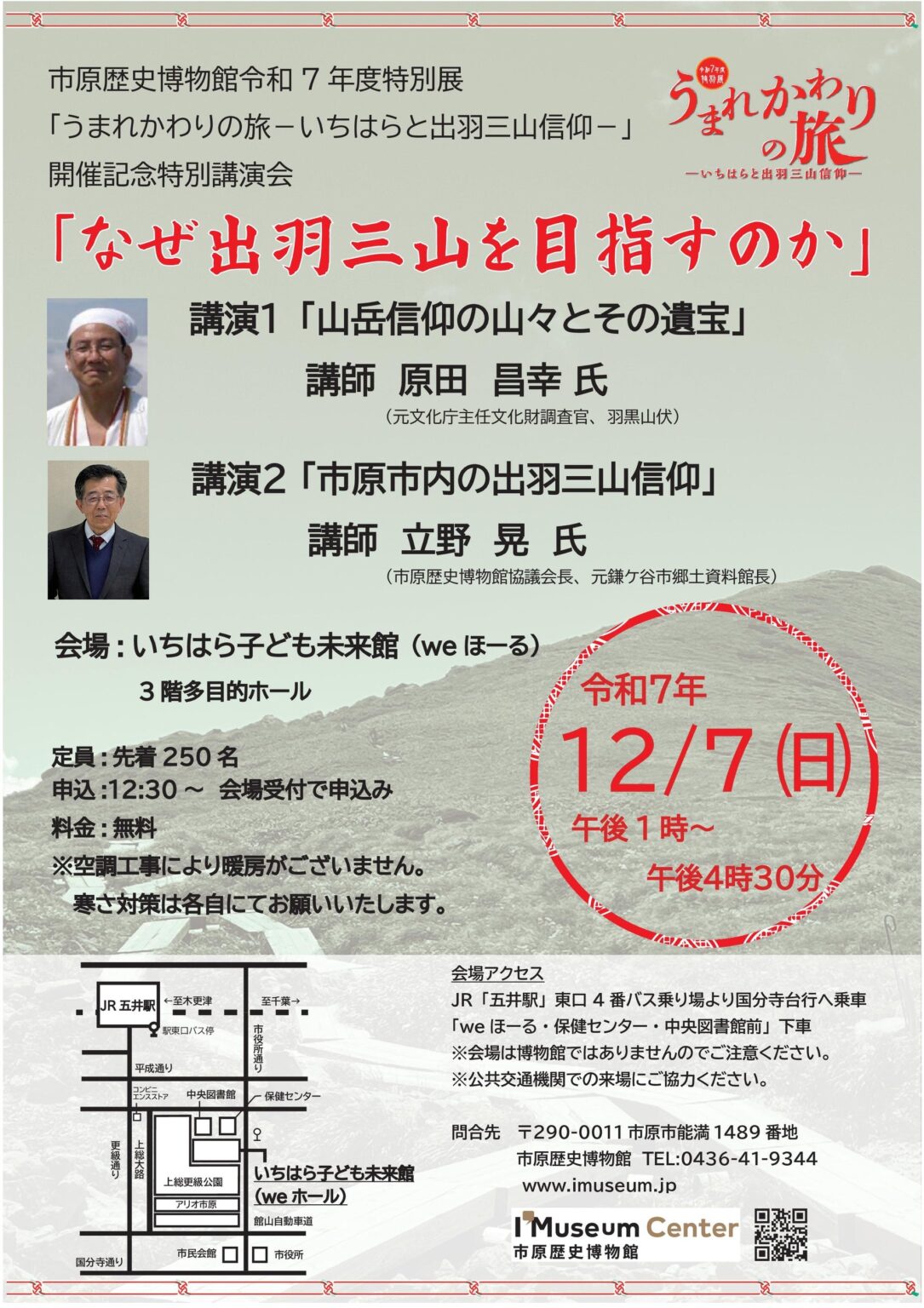 千葉県市原市の市原歴史博物館は、2025年12月7日13時~16時30分に、出羽三山信仰をテーマにした講演会「なぜ出羽三山を目指すのか」を開催します。会場は歴史体験館内中央広場ステージ付近で、定員は先着250人、参加費は無料です。受付は12時30分から行われます。