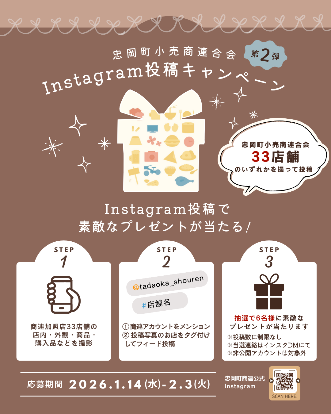 大阪府泉北郡忠岡町の忠岡町小売商連合会は、町内の加盟33店舗を対象にしたInstagram投稿キャンペーンを2026年1月14日~2月3日に実施します。参加者は店舗で撮影した写真をInstagramのフィードに投稿し、公式アカウントをメンションしつつ、撮影店舗のアカウントまたは店舗名をタグ付けして応募します。抽選で計6人に菓子詰め合わせや入浴剤、ランチ、刺身盛り合わせなど加盟店の人気商品・サービスが当たります。投稿は1件につき1口で複数応募が可能です。ストーリーズ投稿は対象外で、非公開アカウントも応募対象になりません。当選連絡はDMで行い、撮影時は各店舗のルール順守を求めます。取り組みの狙いは、買い物や外食といった「日常の一枚」を通じて商店の魅力を可視化し、町内外の来店や交流のきっかけを増やすことです。周辺都市に囲まれ通過点として見られがちな地域でも、写真投稿が情報発信の裾野を広げる手段になり得るとしており、今後は加盟店間の連携や継続企画につながるかが焦点です。