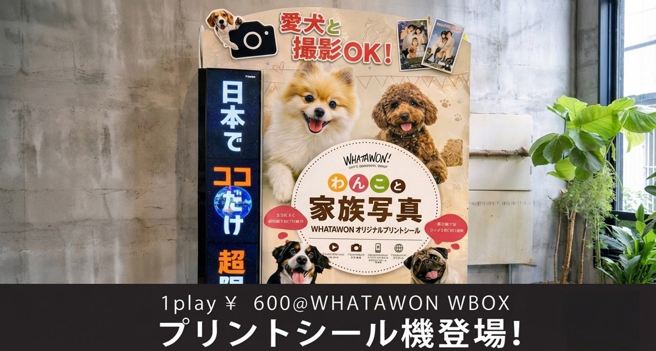 大阪府岸和田市の滞在型エンターテインメントモール「WHATAWON(ワタワン)」内のWBOXに、愛犬・ペットと一緒にブースへ入って撮影できるプリントシール機が新たに設置されました。料金は通常印刷が1コイン600円、大判印刷が2コイン1,000円です。