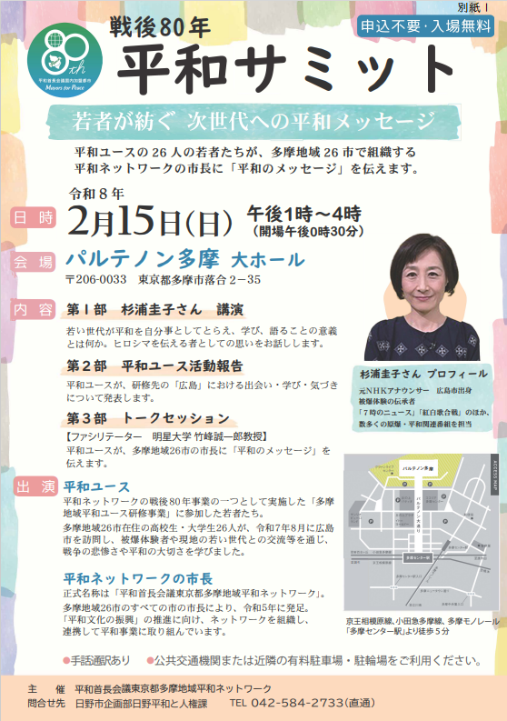 多摩地域26市の高校生から大学生までの若者26人でつくる「平和ユース」が、戦後80年に合わせた「平和サミット」を2026年2月15日13時~16時にパルテノン多摩(東京都多摩市)で開き、市長らに向けた平和メッセージを発表します。主催は、平和首長会議に加盟する多摩26市で構成する「平和首長会議東京都多摩地域平和ネットワーク」です。第1部は元NHKアナウンサーで被爆体験の家族伝承者でもある杉浦圭子さんが講演し、その後に平和ユースの活動報告とメッセージ発表、市長とのトークセッションを行います。松井一實・広島市長が来場し講評する予定です。平和ユースは同ネットワークの研修事業参加者で、2025年8月に広島を訪れて被爆体験者の聞き取りや現地の若い世代との交流を実施しました。今後は、研修で得た学びを共有し、地域での継続的な平和教育や発信につながるかが焦点です。