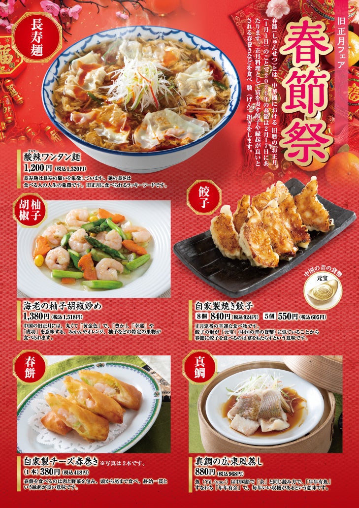 焼肉坂井ホールディングスグループの中国料理「敦煌」は、旧正月に合わせたフェア「春節祭」を令和8年2月17日〜3月31日に実施し、縁起を担いだ限定メニュー5種類を提供します。実施店舗は山口小野田店、山口宇部店、山口周南店、広島グランドタワー店です。
