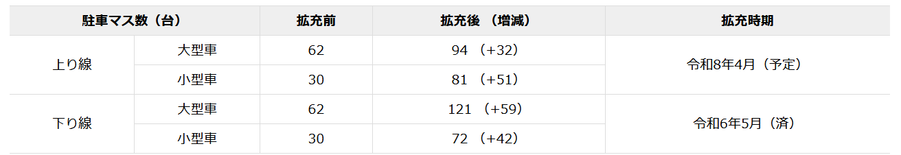 今後は駐車マス拡充も進める方針で、令和8年度内には茨木千提寺PA(上下線)でもシャワーステーション新設を予定しています。