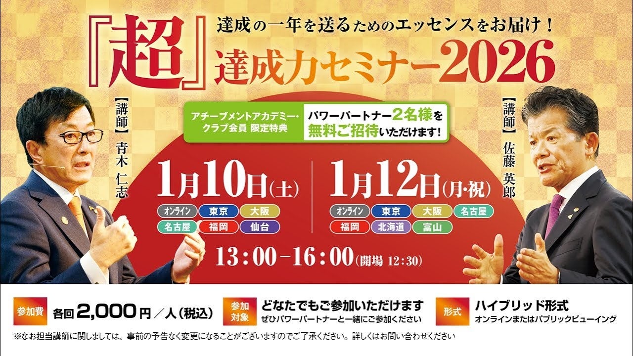 新年に目標を立てても、すべて達成できる人は6.7%にとどまります。アチーブメント(東京都江東区)は2026年1月10日と12日、目標達成をテーマにした「『超』達成力セミナー」を13時〜16時に開き、参加費は各回2,000円です。申込は約6,000人で過去最大規模となりました。