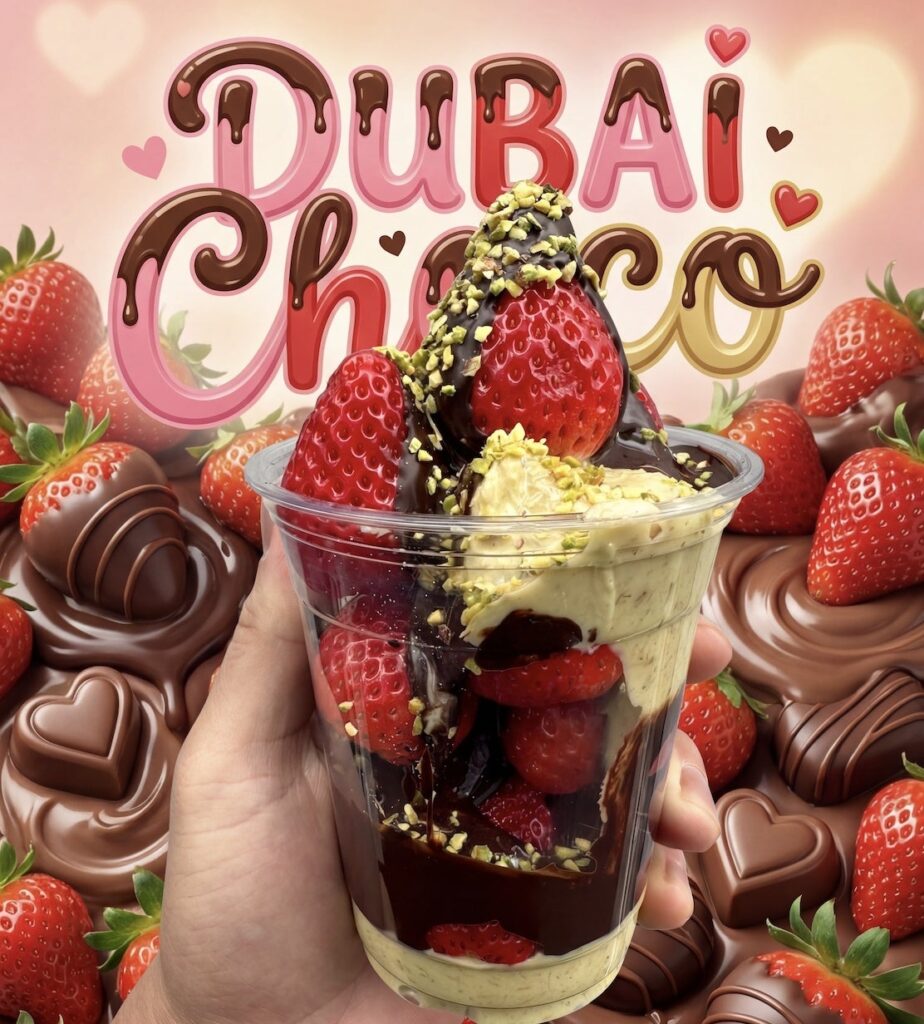 「ドバイチョコ」は、中東発祥の菓子で、ピスタチオペーストとカダイフ(細い麺状の生地)を混ぜたクリームをチョコレートで包み、ザクザクした食感が特徴です。商品は高品質の苺を毎日直送し、クーベルチュールチョコレートで提供するとしています。