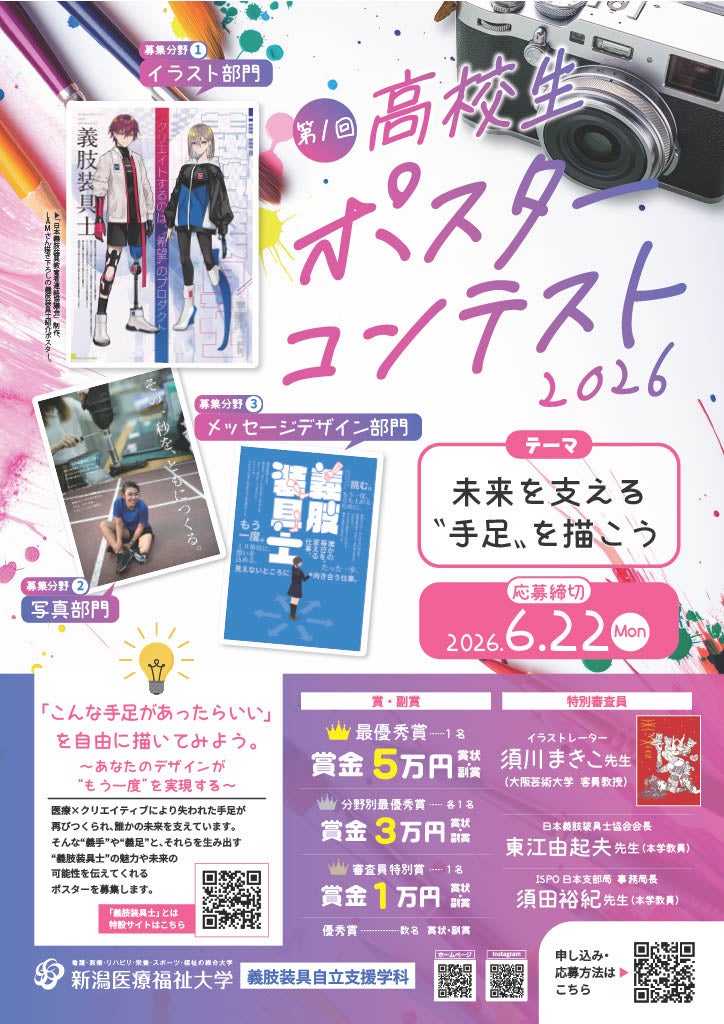 新潟医療福祉大学の義肢装具自立支援学科は、高校生向けの「第1回 高校生ポスターコンテスト ~未来を支える“手足”を描こう。~」を初開催し、作品募集を始めました。応募締切は2026年6月22日で、1名または1グループにつき応募は1点までです。