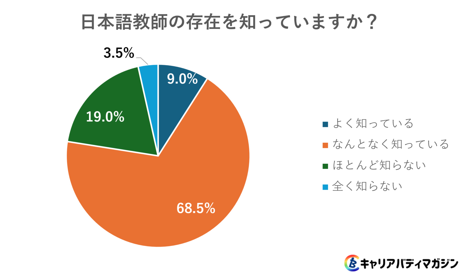 調査はキャリア関連メディア「キャリアバディマガジン」(運営:合同会社キャリアバディ)が、クラウドワークスを通じて実施しました。回答者の年代は30代35.5%、40代38.5%が中心で、20代8.0%、50代13.5%、60代以上4.5%でした。日本語教師という職業自体は、「よく知っている」9.0%と「なんとなく知っている」68.5%を合わせて77.5%が認知しており、職種名は比較的知られていることがうかがえます。