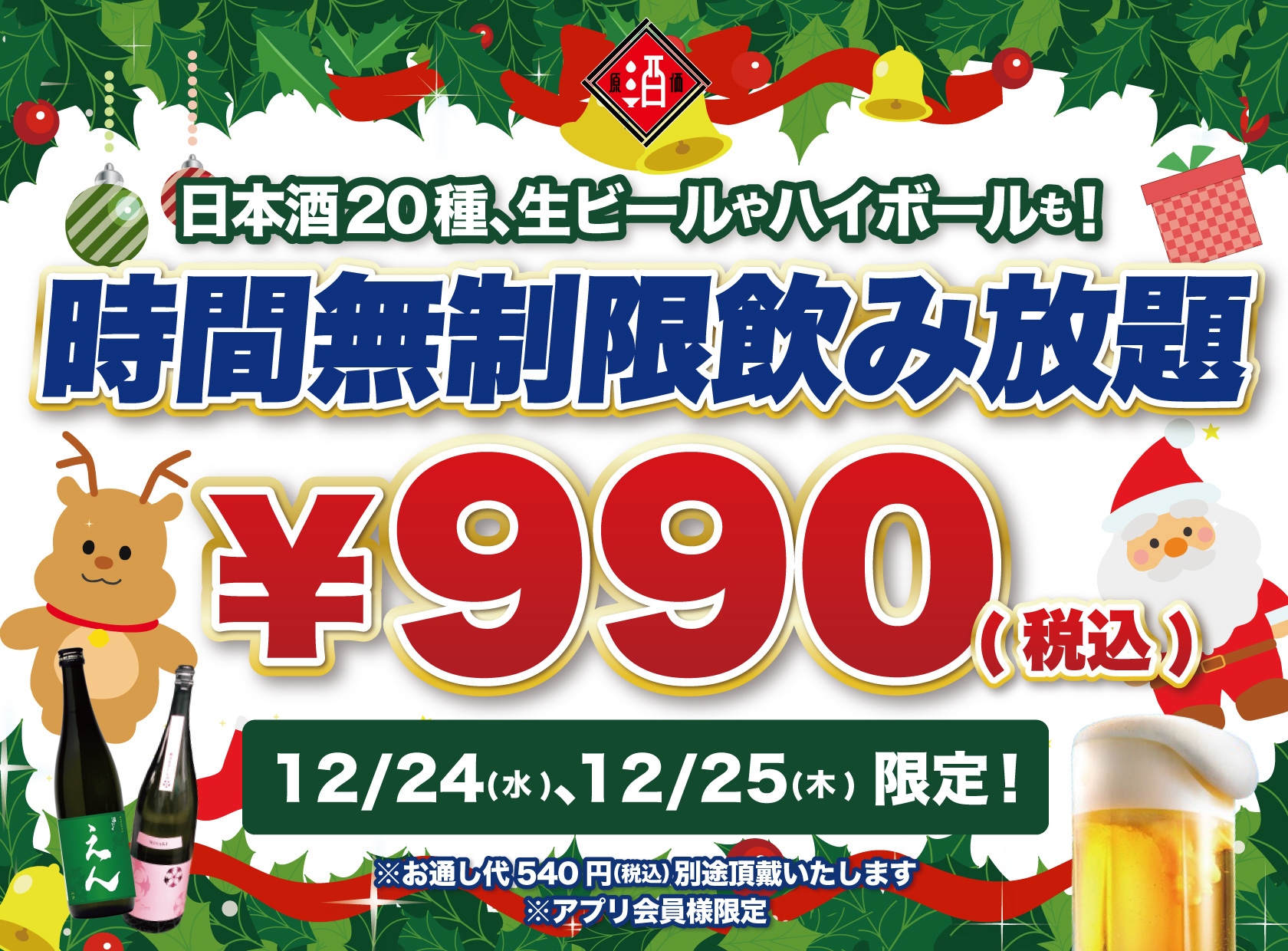 日本酒原価酒蔵は12月24日と25日の2日間、全店(一部除く)で時間無制限の飲み放題を990円(税込)から提供します。対象は30種の飲み放題で、1日各店舗20人まで。利用には来店時にアプリ配布クーポンの提示が必要です。お通し代は491円(税込540円)で、料理は1人2品以上の注文が条件となります。