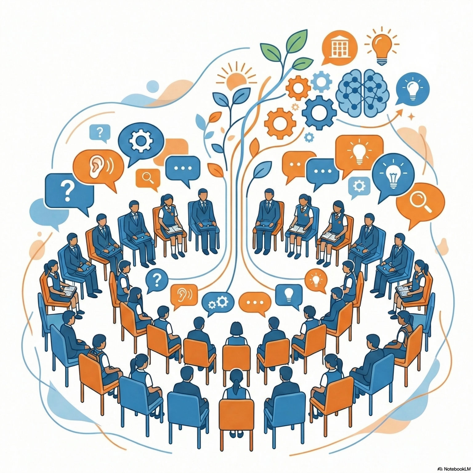 会場はネクシティパレッタ105・106室(COMEET BRIDGE)です。企業側が一方的にPRする形ではなく、立場の違いを越えて意見を交わす「共創」を重視し、参加者は囲み型レイアウトで全体討論を行います(高校生と青年部が交互に座る楕円の二重円)。