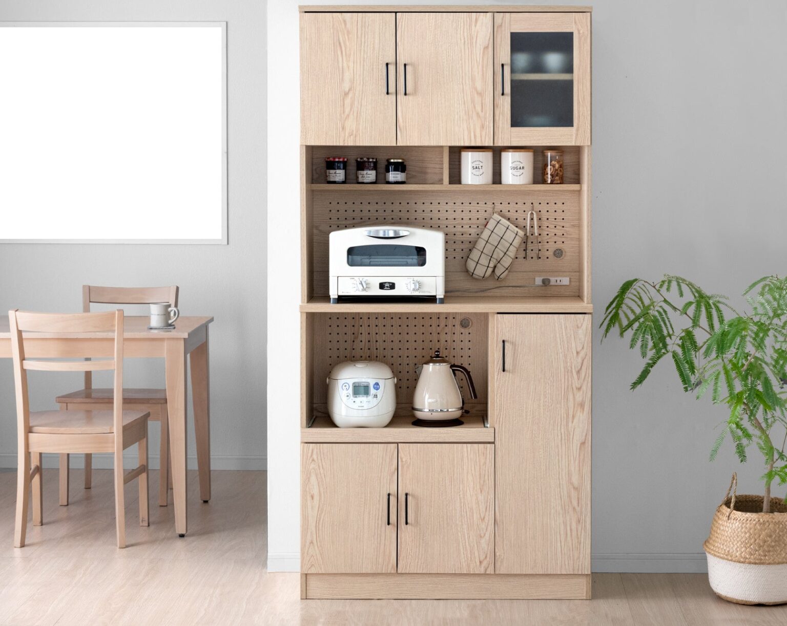 タンスのゲンは12月26日、有孔ボード付きのキッチン収納(外寸:幅89×奥行40×高さ180cm、約48kg)を発売しました。奥行39cmのオープンスペースで電子レンジなどを置きやすく、天板耐荷重約30kgとしています。新生活で増えがちな家電や食器、食品ストックの「置き場不足」対策を狙います。背面の有孔ボードはフックでツールを掛けられ、炊飯器の蒸気やレンジの熱がこもりにくい構造です。下段にはスライド棚(耐荷重約10kg)を備え、家電使用時に引き出して蒸気を逃がしやすくしています。上段・下段の扉収納は可動棚で5段階調整に対応し、棚板は約5kg、最下段は約10kgの耐荷重です。カラーはシャビーアッシュなど2色で、同シリーズのカウンターと連結でき、住まいの広さに合わせた拡張も見込まれます。