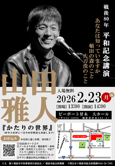 福岡県朝倉市は2026年2月23日、戦後80年の節目に「平和記念講演」をピーポート甘木で開きます。俳優・芸人の山田雅人氏が取材を重ねて書き下ろした語りで、「頓田の森の悲劇」などを題材に平和の尊さを伝えます。入場は無料で事前申込制、定員に達し次第締め切ります。講演で扱う「頓田の森の悲劇」は1945年3月27日、大刀洗飛行場への空襲の混乱下で、避難していた児童らがいた頓田の森に爆弾が落下し31人が死亡した出来事です。山田氏は同作のほか「中村哲医師の物語」も語る予定で、地域の記憶を次世代へつなぐ場とします。市は参加を通じ、戦争被害の具体像を学ぶ機会が広がるか注目されます。今後は定員や参加者層の広がりが継続的な平和学習につながるかが焦点です。