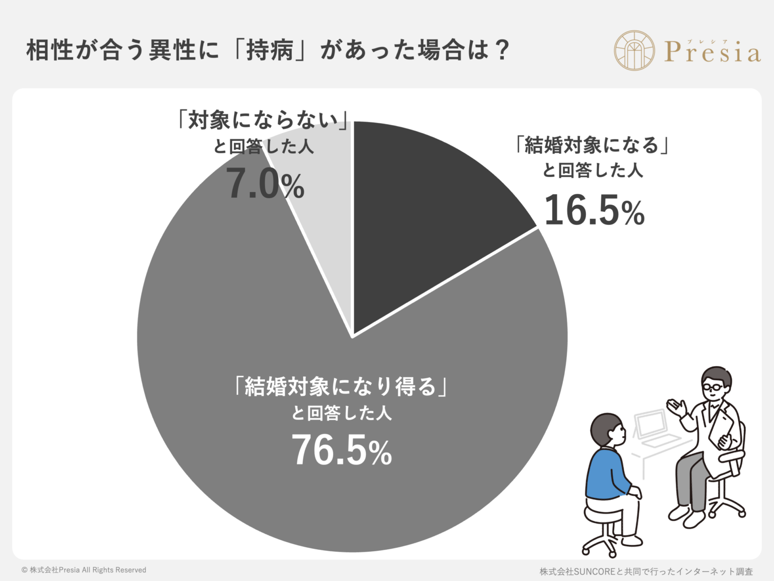 20代〜50代の未婚男女200人を対象にした調査で、性格や価値観の相性が良い相手なら、持病があっても結婚相手の対象になり得ると答えた人が93.0%に上りました。内訳は「病状や生活への支障次第で対象になり得る」76.5%(153人)、「持病は気にしないので対象になる」16.5%(33人)、「対象にならない」7.0%(14人)でした。調査は結婚相談所Presiaを運営する株式会社Presiaが2025年12月に実施しました。