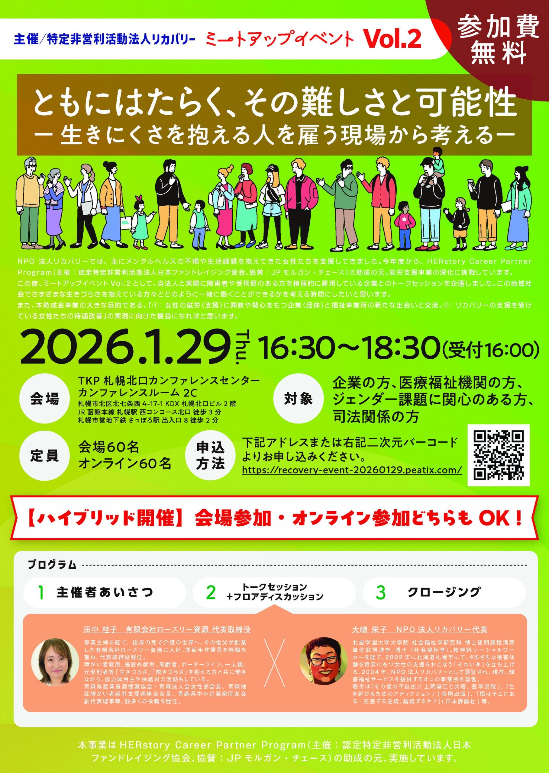 NPO法人リカバリー(札幌市)は2026年1月29日16時30分~18時30分、ミートアップイベントVol.2「ともにはたらく、その難しさと可能性」をTKP札幌北口カンファレンスセンターとZoomのハイブリッドで開きます。参加費は無料で、会場定員は60人、オンライン当日参加も60人(いずれも同日12時まで申込)です。