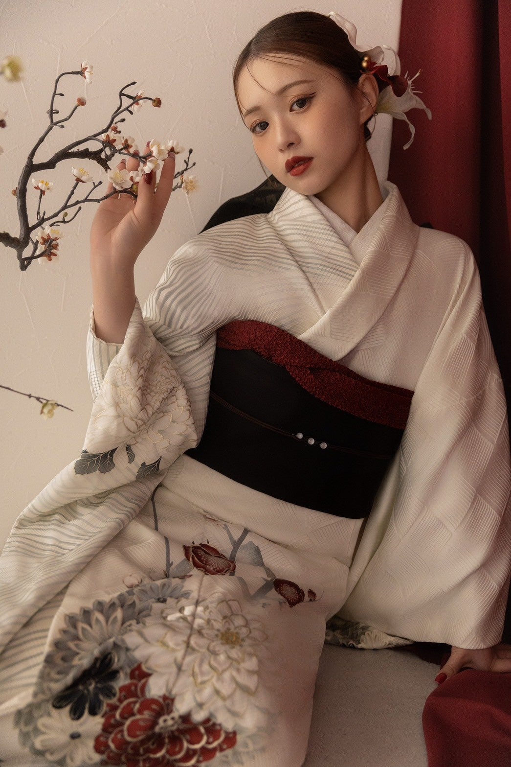新ビジュアルは、古典的な和装美と現代的なスタイリングを組み合わせた「現代モダン」テイストがテーマ。振袖は白・黒・赤の3色に色数を絞り、装飾を抑えたデザインで、モードで洗練された印象を打ち出します。ヘアはタイトシニヨンに大ぶりの白いユリと深紅の花を合わせ、メイクはマットな深紅リップとブラウン系アイメイクで大人っぽさと和の色気を演出しています。