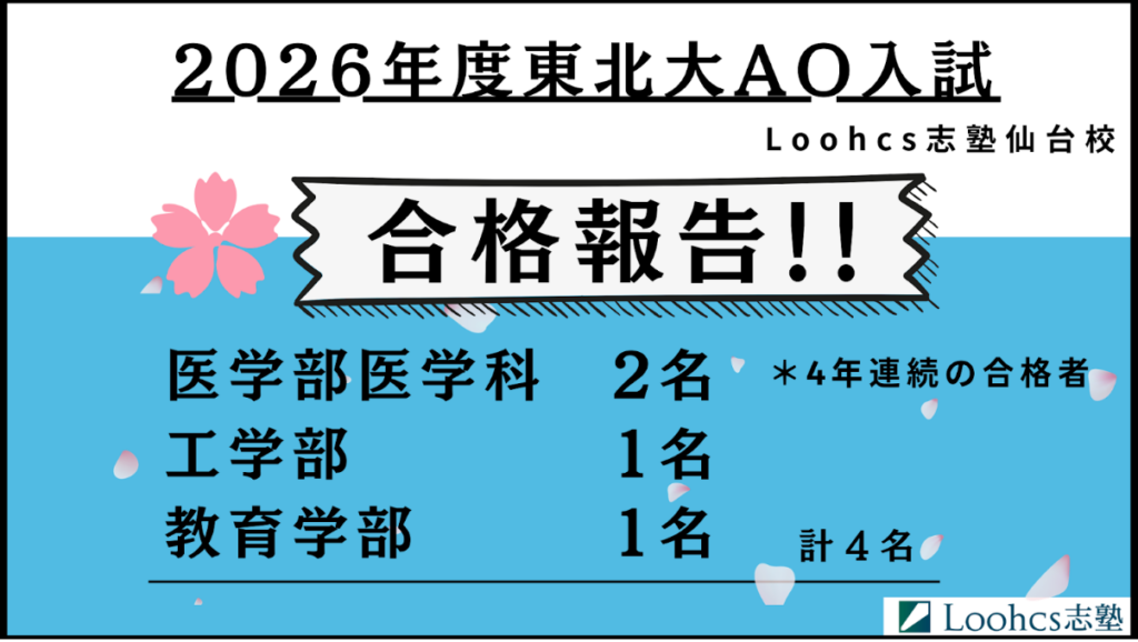 総合型選抜(AO入試)対策塾のLoohcs志塾仙台校によると、2026年度の東北大学AO2期・3期で計4人が合格し、このうち医学部医学科は2人でした。医学部医学科の合格者は4年連続だとしています。