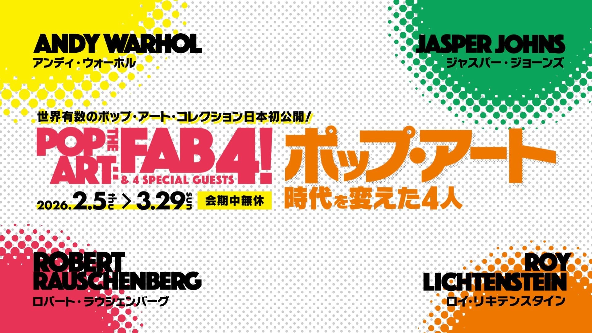 本展はザ・ビートルズの愛称「The FAB 4」になぞらえ、ロイ・リキテンスタイン、アンディ・ウォーホル、ロバート・ラウシェンバーグ、ジャスパー・ジョーンズの4作家に焦点を当てます。あわせてロバート・インディアナ、ジェームズ・ローゼンクイスト、トム・ウェッセルマン、ジム・ダインの作品も取り上げ、章立て(PART I〜III)で誕生背景から広がりまでをたどります。