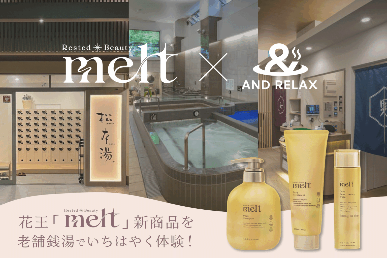AND RELAXは、花王ヘアケアブランド「melt」の新商品「melt ディープ シャンプー/ディープ トリートメント」を、東京・東中野の老舗銭湯「松本湯」の創業90周年記念イベント期間中の2026年2月23日から28日まで、浴室内で先行体験できる施策を実施します。来館者には自宅用サンプルも配布します(なくなり次第終了)。