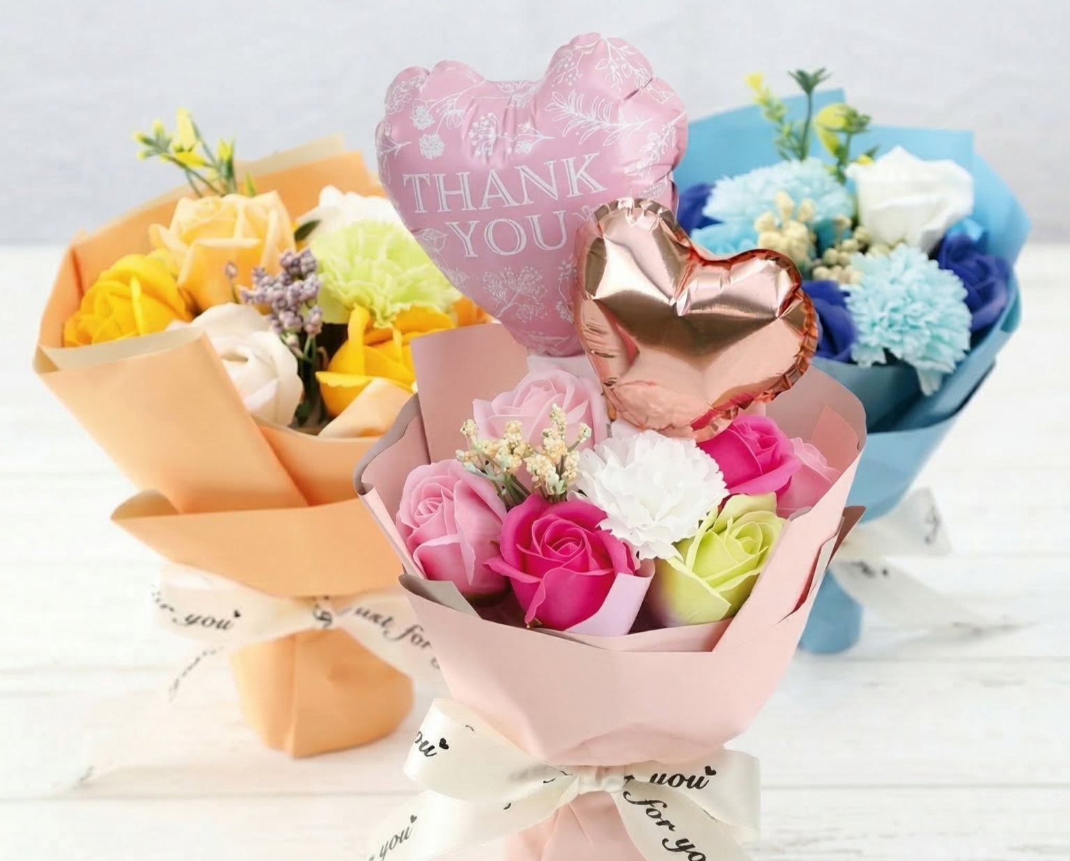 商品は、石けん素材で作られた「ソープフラワー」のスタンディングブーケに、ハート型バルーンとメッセージバルーン2本をセットにした構成です。サイズは高さ26cm×横幅14cm×奥行14cmで、ラッピング済み・手提げ袋も付属し、受け取ってすぐ飾れる仕様としています。
