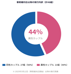 Famieeは2021年2月に同性カップル向けに開始し、2025年5月12日から事実婚(異性カップル)にも対応しました。事実婚対応開始前の累計は60組でしたが、開始後は48組増え、うち同性27組・異性21組でした。開始後の48組に占める異性カップル比率は約44%です。