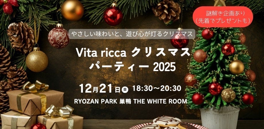 池袋のセレクトショップVita ricca(ビータ リッカ)は、クリスマスイベント「Vita ricca クリスマスパーティー 2025」を2025年12月21日18時30分〜20時30分に開催します。会場はRYOZAN PARK 巣鴨 THE WHITE ROOM(東京都豊島区巣鴨1-9-1)で、参加費は5000円(当日現金)です。