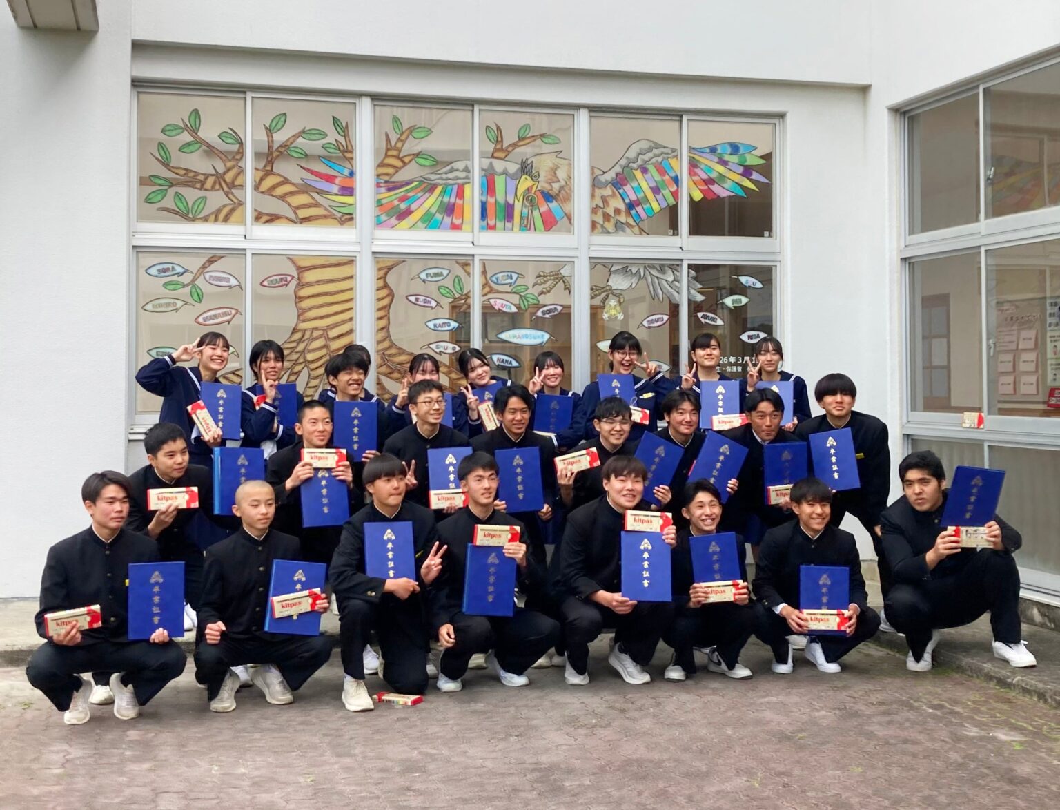 鹿児島県沖永良部島の知名町立知名中学校で2026年3月11日、第68回卒業式に合わせて窓ガラスを使った「卒業ウィンドウアート」が披露され、卒業生27名のサプライズとなりました。窓に描いて消せる画材「キットパス」を製造する日本理化学工業(神奈川県川崎市)が制作を支援しました。