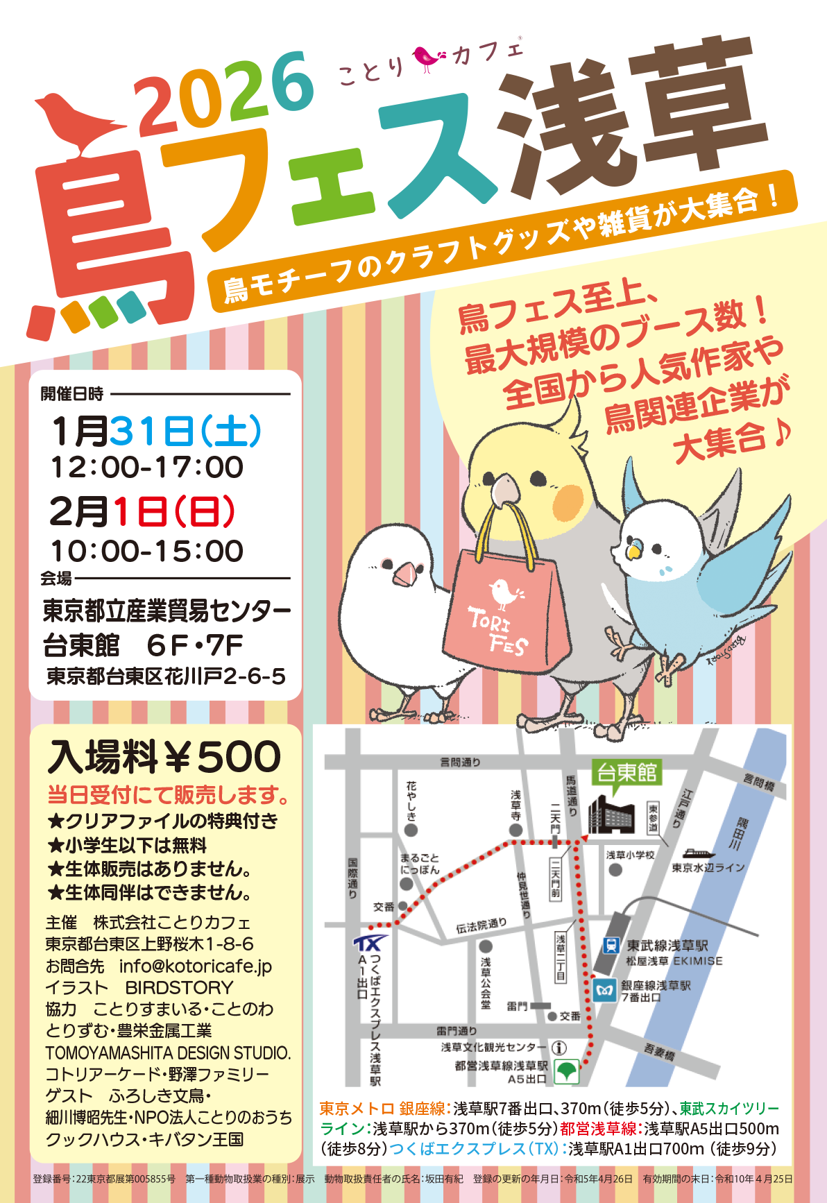 鳥好き向けイベント「鳥フェス浅草2026」が、2026年1月31日と2月1日の2日間、東京都立産業貿易センター台東館(東京都台東区)6F・7Fで開かれます。出展者は全国から約200組を予定し、入場料は500円(小学生以下無料)です。来場特典としてA5サイズのクリアファイルが付きます。