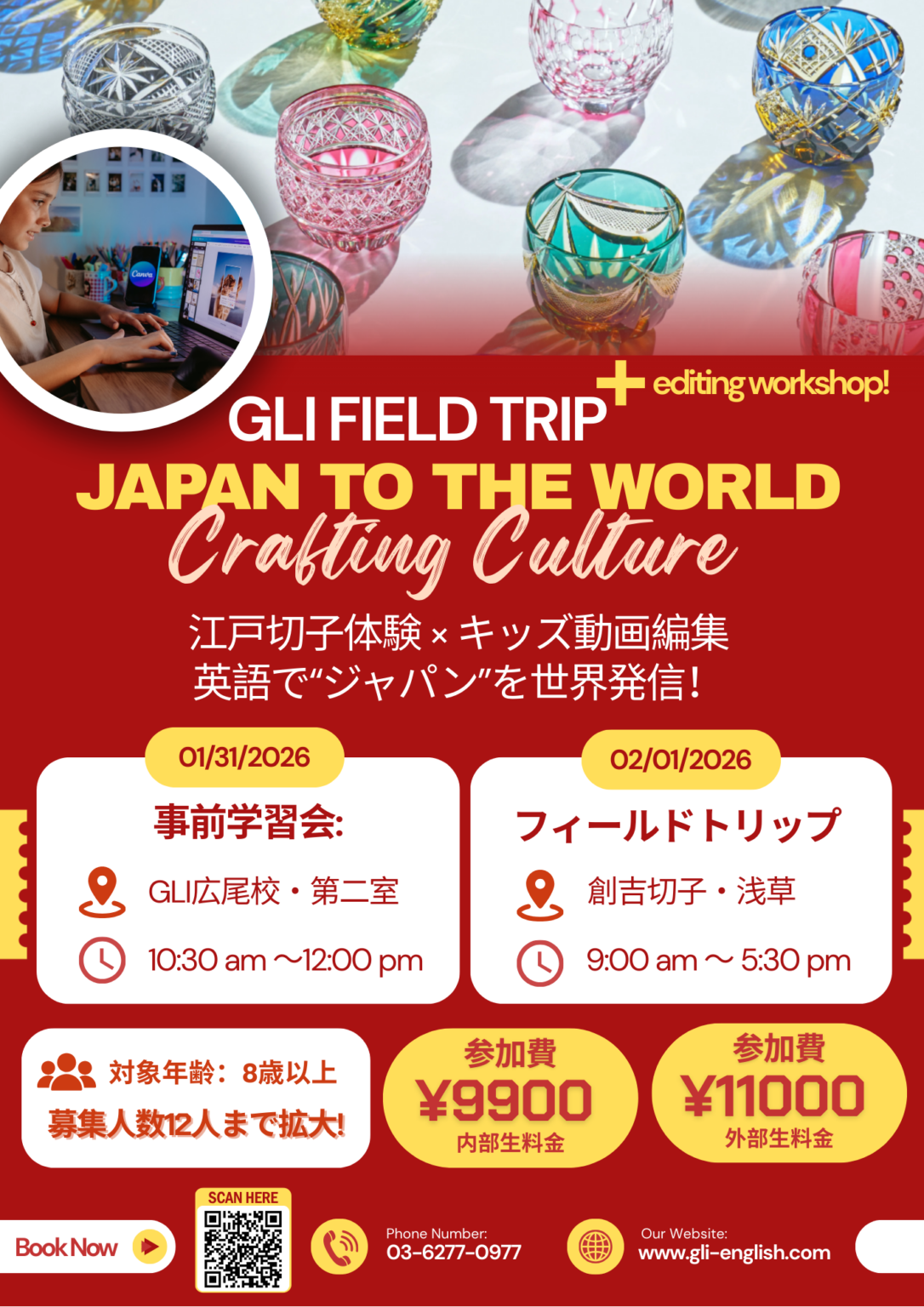 Global Learner’s Institute(GLI)は2026年2月1日、体験型学習プログラム「フィールドトリップ Plus」を東京・浅草で実施します。対象は小学3年生〜高校生で定員12人、参加費はGLI生9,900円、外部生11,000円(税込、江戸切子体験料込み)です。江戸切子の制作体験に加え、英語での動画制作やプレゼンテーションまで行います。